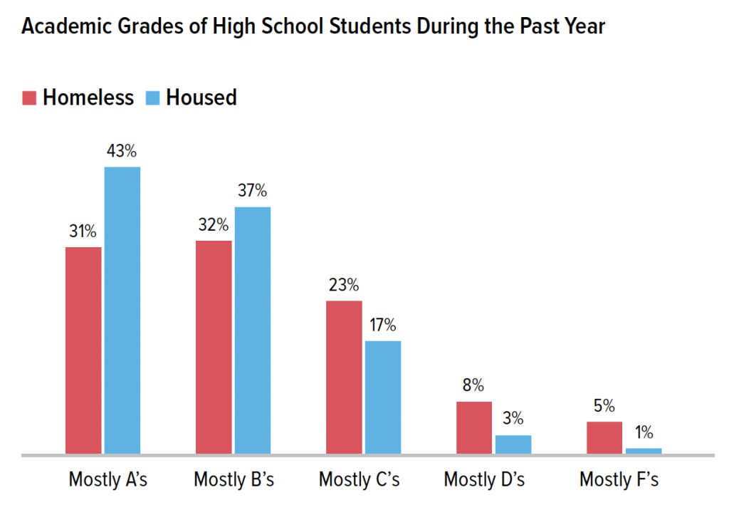 Although school engagement is important for homeless students who may feel otherwise disconnected from other adults and institutions, they reported receiving lower grades and were less likely to participate in sports or other extracurricular activities than their housed peers. Homeless high school students were also less likely to feel connected to teachers and to feel a sense of belonging at their schools.