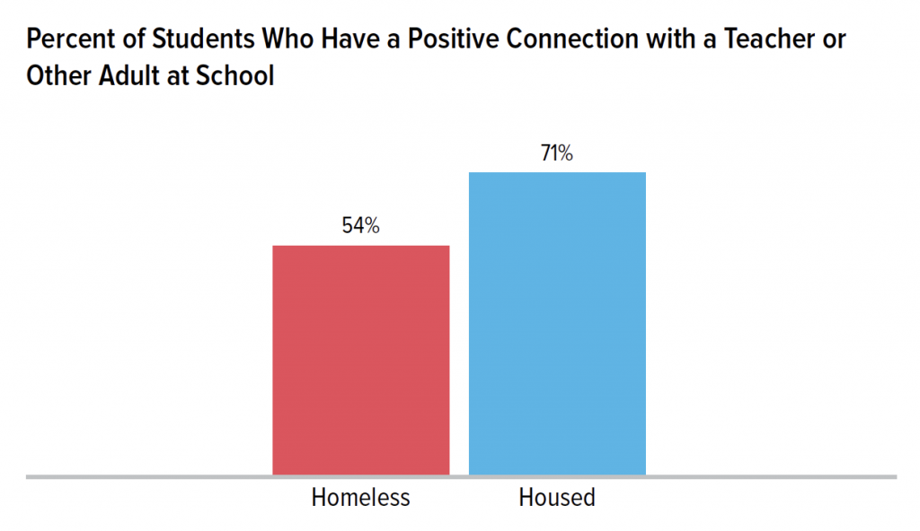Over half of homeless students (54%) said they had a positive connection with a teacher or other adult at school, about 1.3 times lower than housed students (71%).