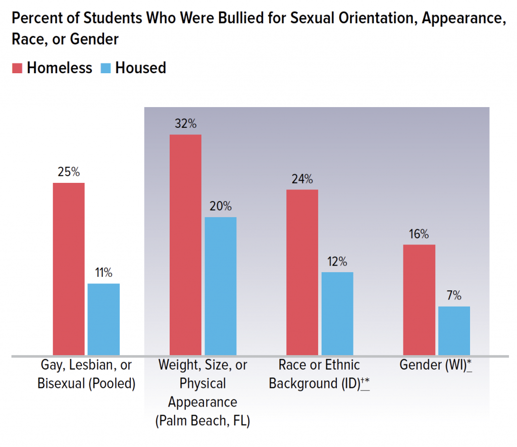 In locales that included other questions regarding identity bullying, homeless students were more likely to report being bullied due to their appearance, race, or gender. One in three (32%) homeless students in Palm Beach, FL were bullied due to their physical appearance, compared to one in five (20%) housed students. Meanwhile, homeless students in Idaho were twice as likely as their housed peers to report being bullied because of their race or ethnicity (24% vs. 12%), and homeless students in Wisconsin were over twice as likely to be bullied because of their gender (16% vs. 7%).