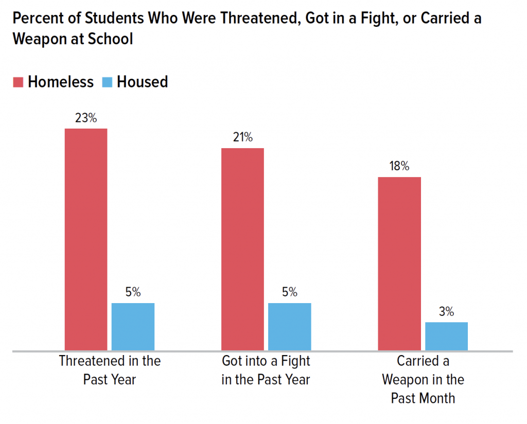 Additionally, students who experienced homelessness were six times more likely than housed students to carry a weapon at school (18% vs. 3%). While it is clear that homeless students experience higher rates of threats and violence at school, these actions may also be the product of violence experienced in their communities, beyond the confines of school.5