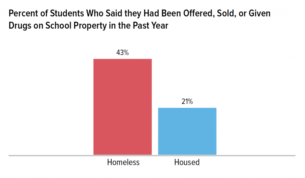 Homeless students were twice as likely as housed students to have been offered, sold, or given drugs on school property (43% vs. 21%).