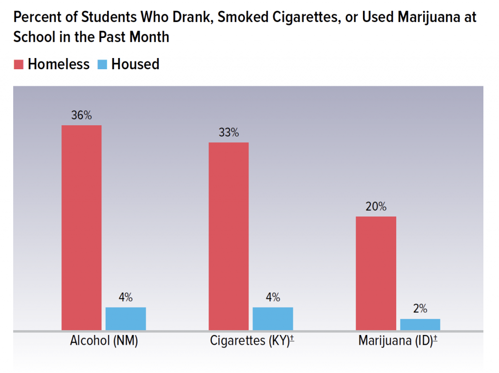 In states that asked about use of specific substances (alcohol, cigarettes, or marijuana) at school, students that experienced homelessness were also more likely to report using these substances at school than housed students. In New Mexico, homeless students were nine times more likely than housed students to drink alcohol at school (36% vs. 4%), while in Kentucky these students were eight times more likely to smoke cigarettes at school (33% vs. 4%), and in Idaho they were ten times more likely to use marijuana at school (20% vs. 2%).
