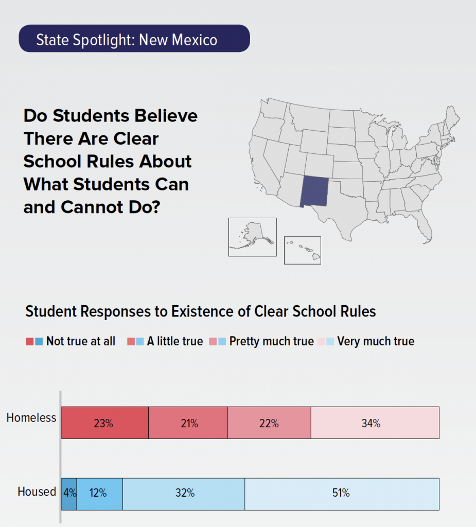 Just over one-third of homeless students (34%) in New Mexico said that it was very much true that there were clear school rules—compared to over half of housed students (51%) who responded this way. Conversely, nearly one-quarter of homeless students (23%) said it was not true at all that there were clear rules about what students could and could not do in school, compared to only 4% of housed students who answered so.