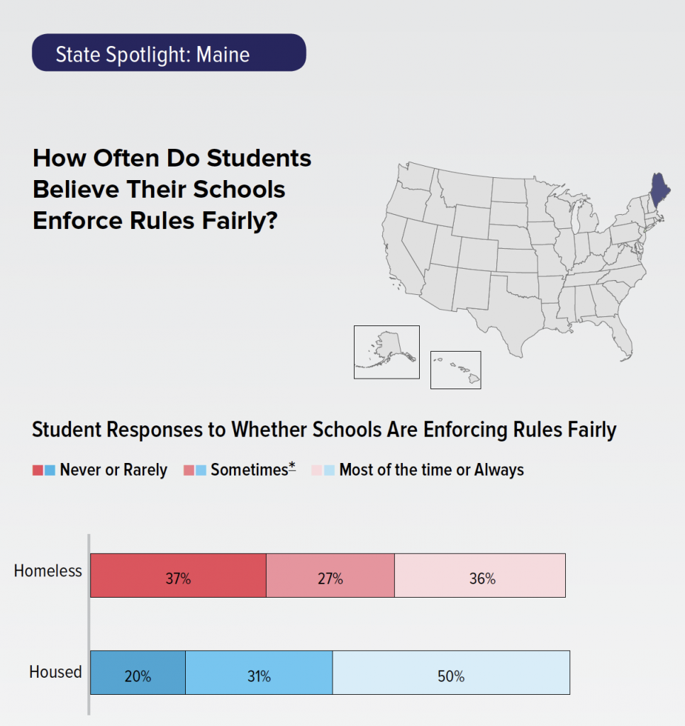More than one-third (37%) of homeless students in Maine say their school never or rarely enforces rules fairly, compared to 20% of housed students. While rules need to be enforced fairly for all students, understanding the circumstances that might lead to a homeless student breaking a rule, like a uniform violation due to lack of access to laundry, is a necessary component of fair and equitable policy and school environment.