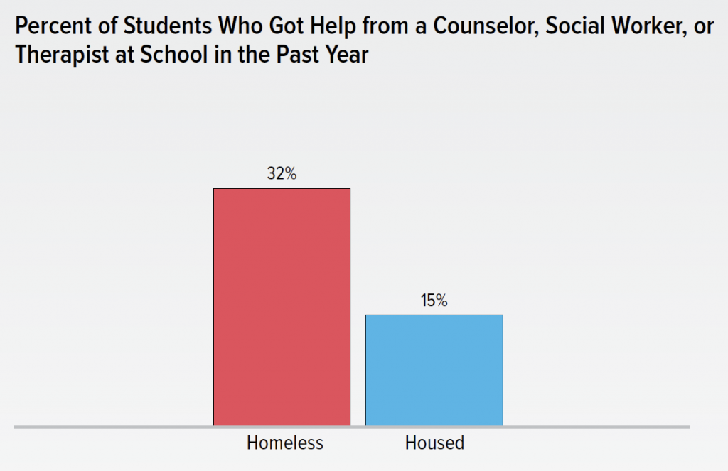 In New York City, 32% of homeless students got help from a counselor, social worker, or therapist at school, over twice the rate of housed students (15%). In addition to having less access to mental health supports outside of school, homeless students are often more in need of these services.