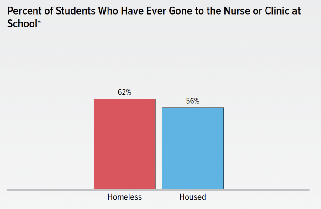 While homeless students in New York City were only slightly more likely than housed students to have ever gone to the nurse or clinic at school (62% vs. 56%), having access to medical services at school is an important component of school environment, as it might be the only opportunity homeless students have to see a doctor or nurse.
