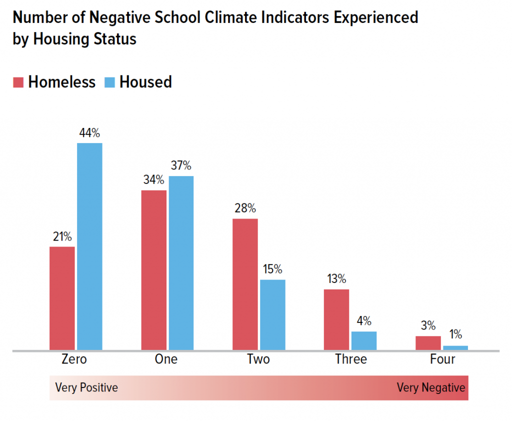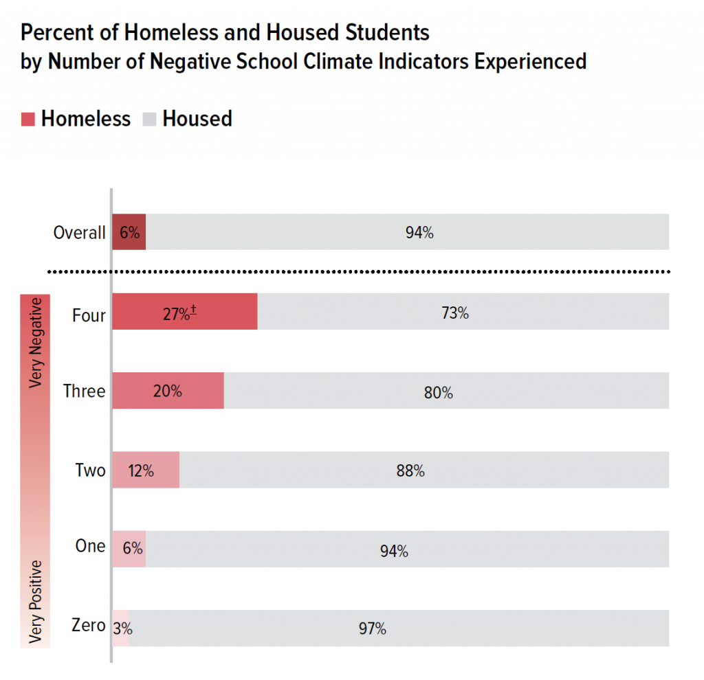 Not only are homeless students more likely than housed students to experience multiple negative school climate indicators, but they are disproportionately represented among students who report multiple indicators.