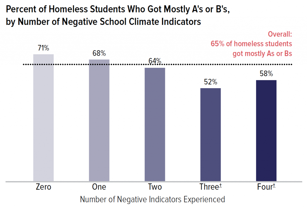 Overall, 65% of homeless students got mostly A’s or B’s. Just 58% of homeless students who experienced all four negative school climate indicators got mostly A’s or B’s, 13 percentage points lower than homeless students who experienced zero negative school climate indicators (71%).