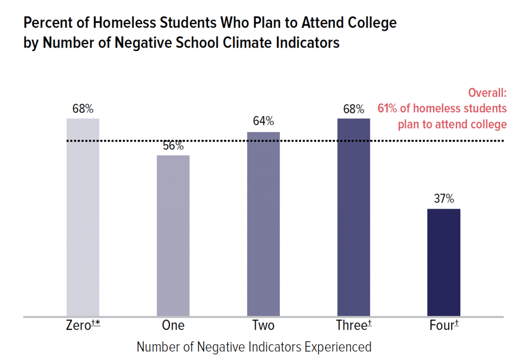 Across school climate groups zero to four, 61% of homeless students planned to attend college, yet only 37% of homeless students who experienced all four negative school climate indicators planned to attend college or pursue other post-secondary education. This was 1.8 times lower than the rate for those students who experienced zero negative school climate indicators (68%).