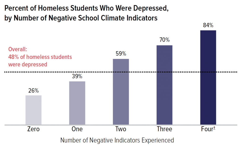 Although depression is not an uncommon experience for homeless students—overall 48% of homeless students reported suffering from depression—there was a clear correlation between the quality of school climate and rates of depression.