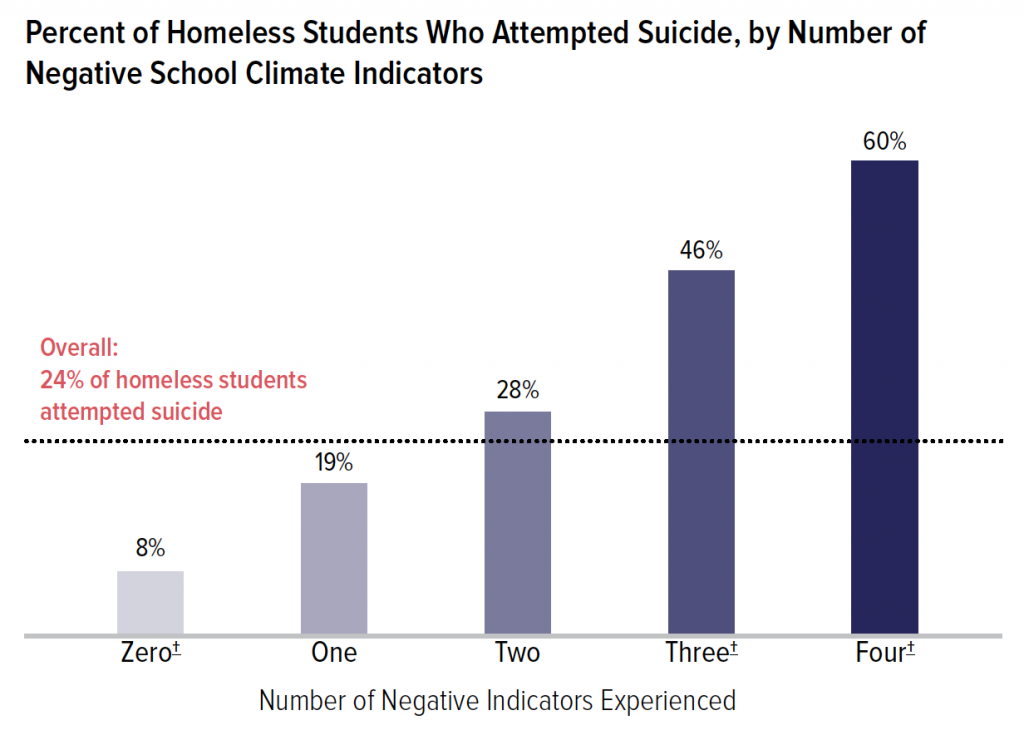 Rates of suicide attempts among students who experienced homelessness, categorized by the number of negative school climate indicators experienced, followed the same trend as depression. Three out of every five homeless students (60%) who experienced all four negative school climate indicators attempted suicide. These students were about 2.5 times more likely than homeless students overall (24%) and over seven times more likely than those who experienced zero negative school climate indicators (8%) to attempt suicide.