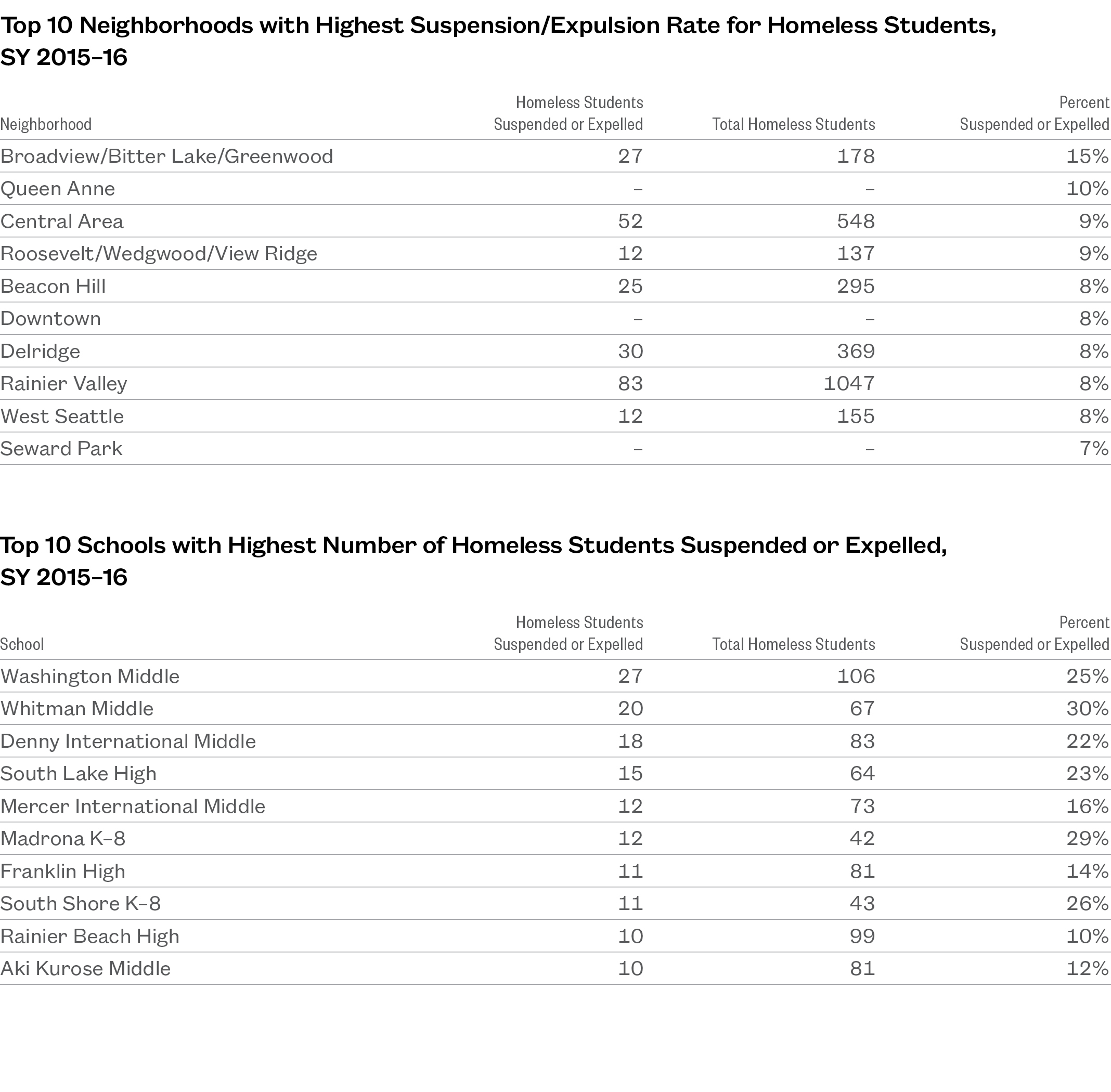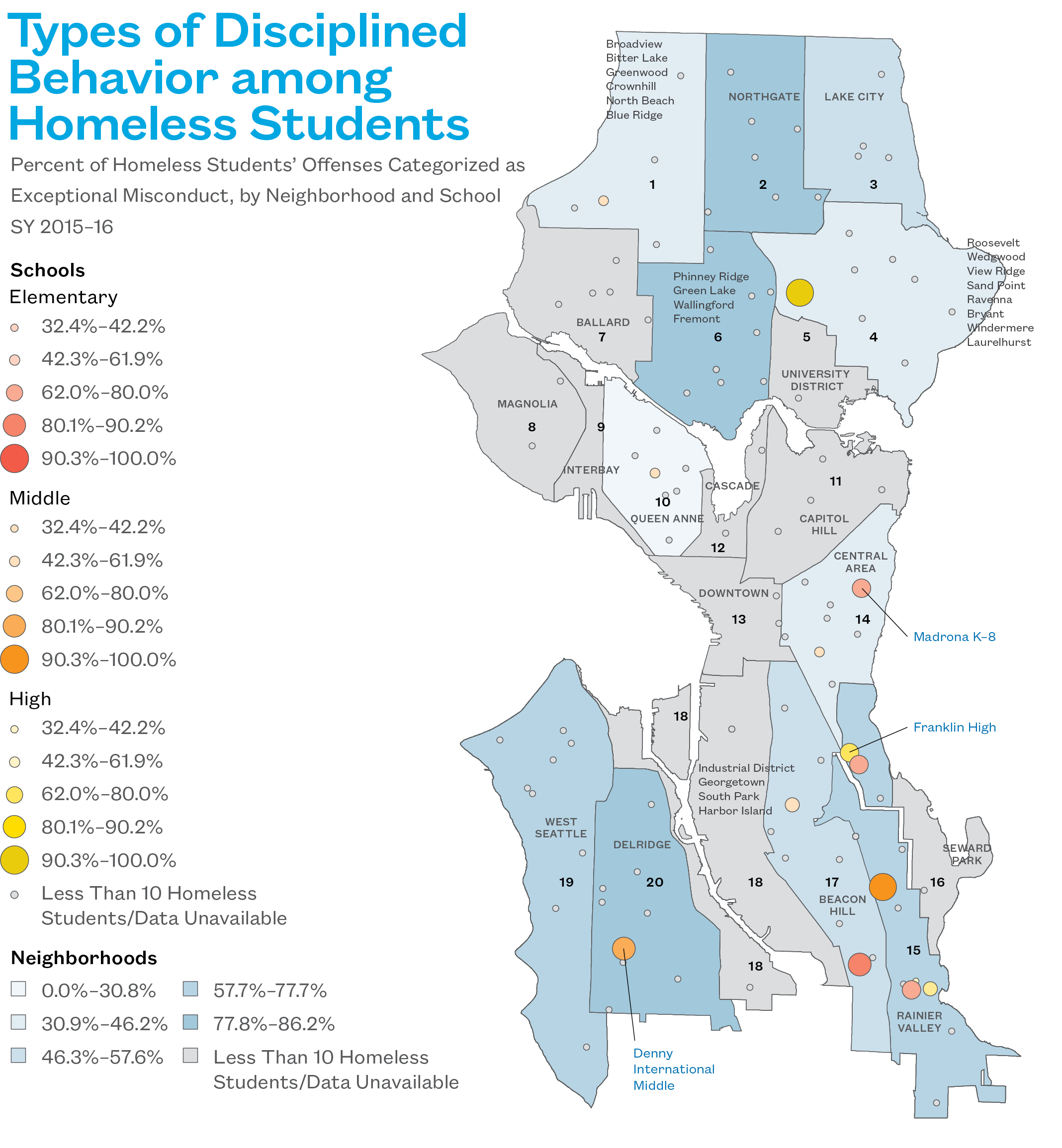 - Fifteen percent of homeless students in the Broadview/Bitter Lake neighborhood were given suspensions or expelled during SY 2015–16.