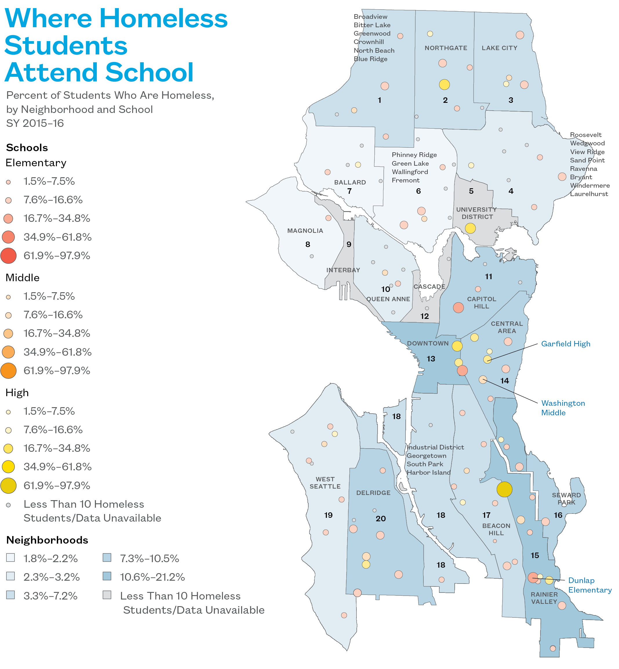 - Since the 2012–13 school year, Capitol Hill, Rainier Valley, and Lake City saw the largest percent increases in number of homeless students.
