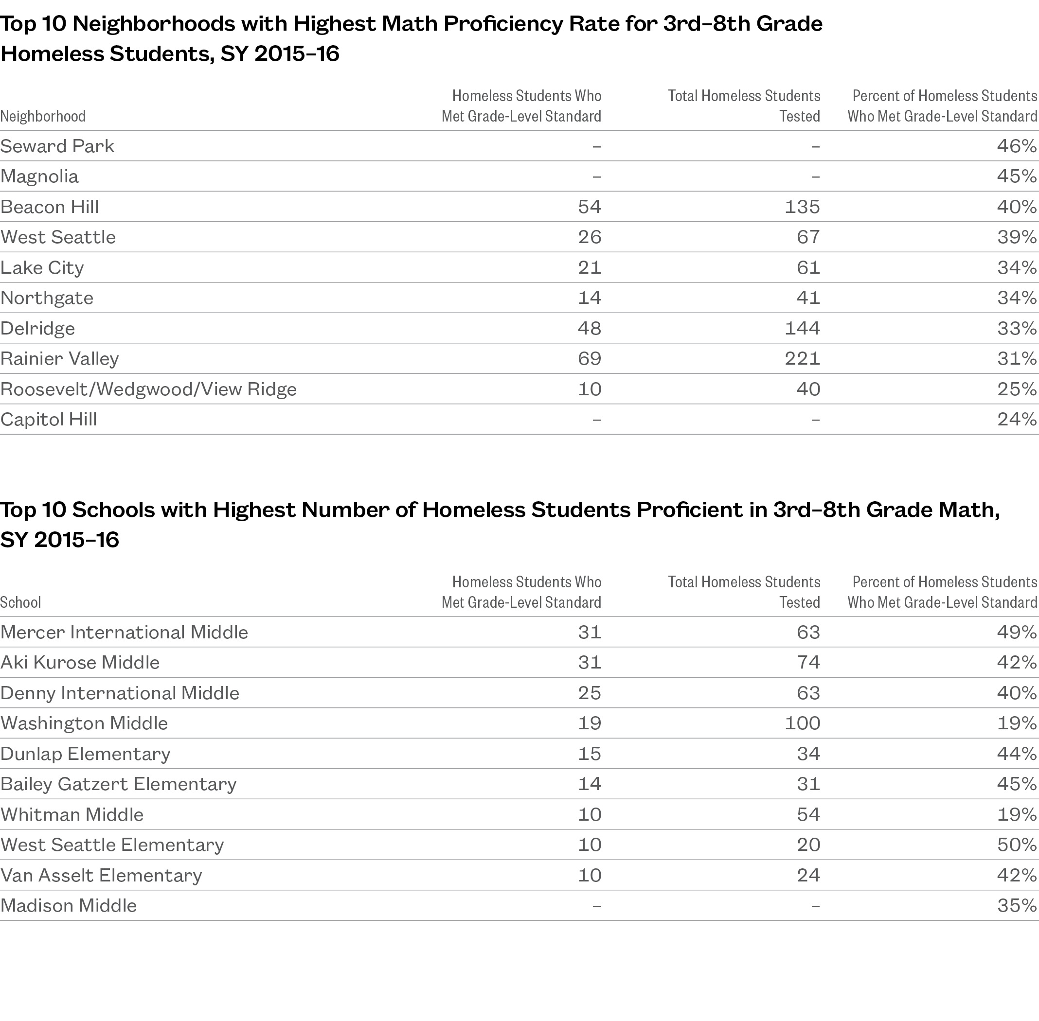 - In schools with at least 10 homeless students tested, West Seattle Elementary and Mercer International Middle had the highest math proficiency rates for their grade levels.