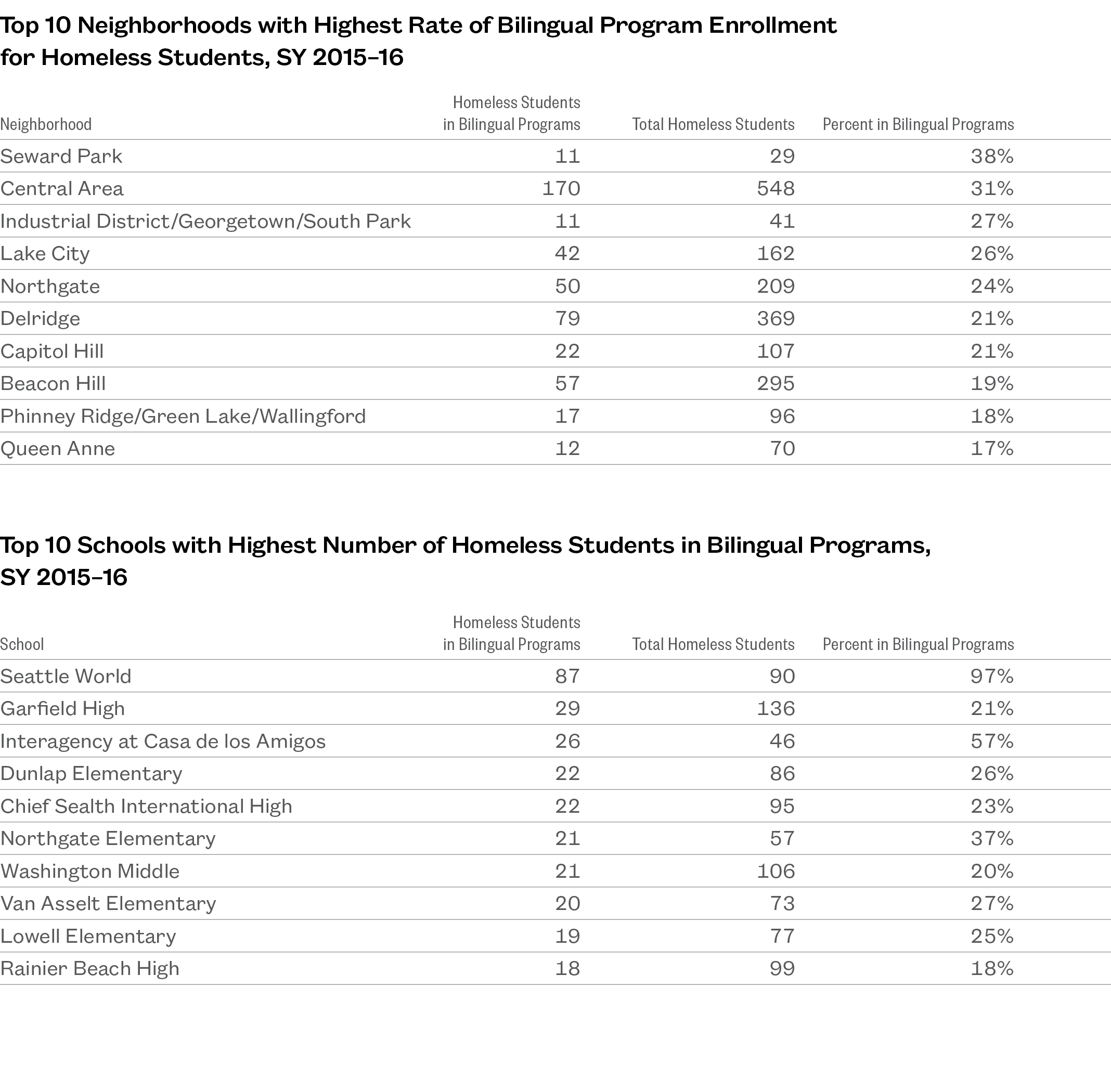 - Among mainstream schools, Adams Elementary, B.F. Day Elementary, and Wing Luke Elementary had the highest rates of bilingual needs among homeless students.
