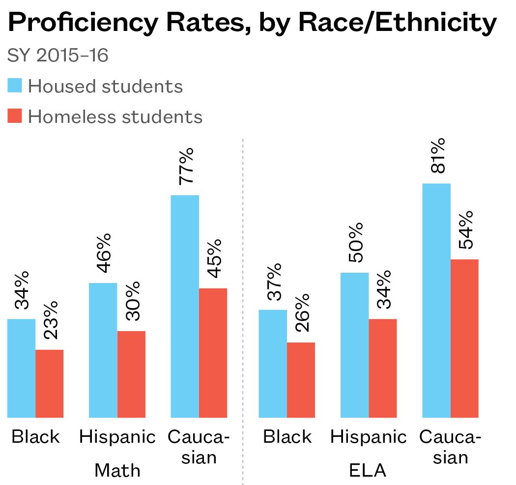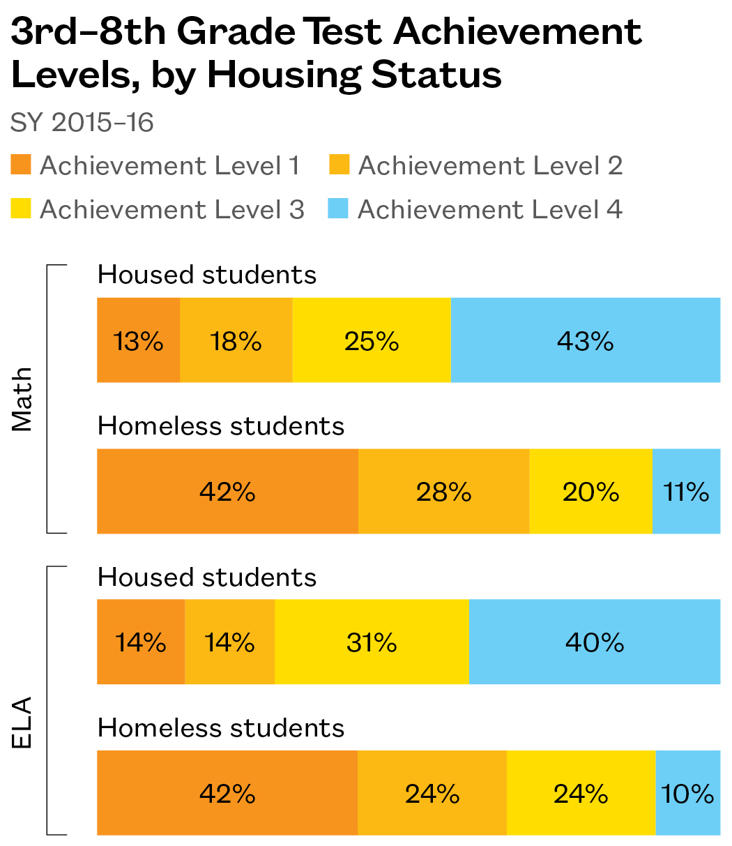 - A student’s type of homelessness presents unique challenges. Only 37% of homeless students were sleeping in a shelter during SY 2015–16. Being doubled up was associated with a much higher likelihood of chronic absenteeism for homeless high school students, while students in shelter were less likely to meet grade-level standards on 3rd-8th grade English Language Arts exams.