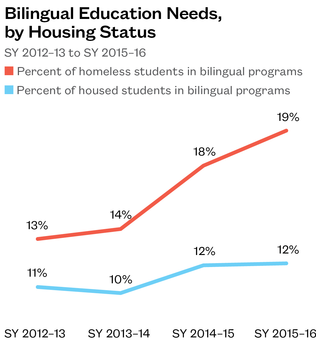 - Between SY 2012–13 and SY 2015–16, the number of homeless students in bilingual programs more than doubled and represented close to one in five of all students. Over the same period, the number among housed students rose by 17%, to slightly less than one in eight of all students.