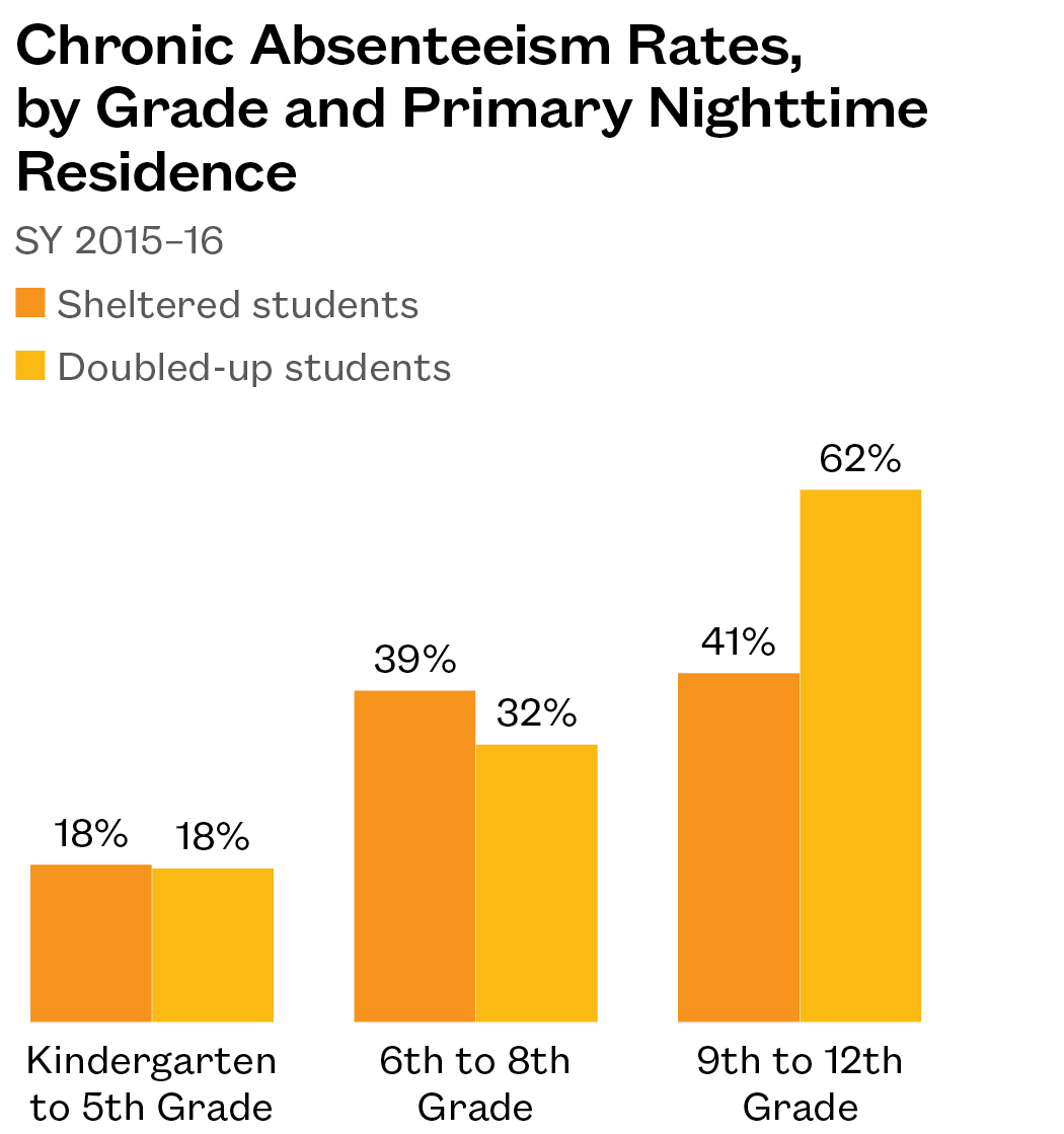 - Rates of absenteeism were roughly equal for homeless students who were in a shelter or doubled-up in elementary or middle school.