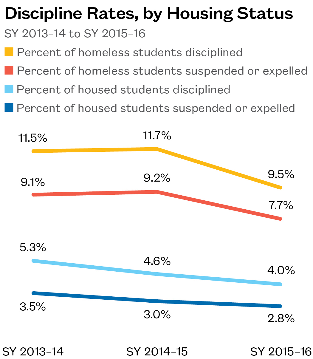 - The percentage of homeless students who were disciplined over the course of the school year declined in SY 2015–16. Homeless students were still being cited, however, at twice the rate of housed students.