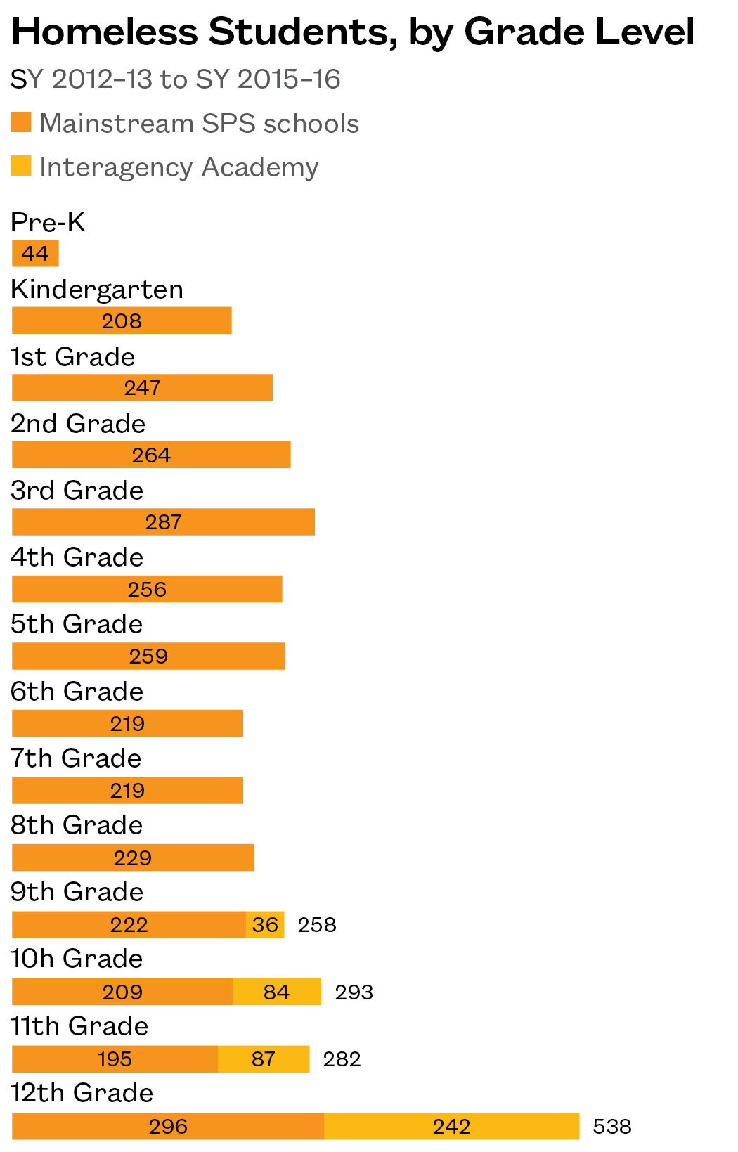 - Interagency Academy, a network of alternative high schools, enrolled over 450 homeless students across Seattle. These students represented 36% of Interagency Academy’s total enrollment in SY 2015–16.