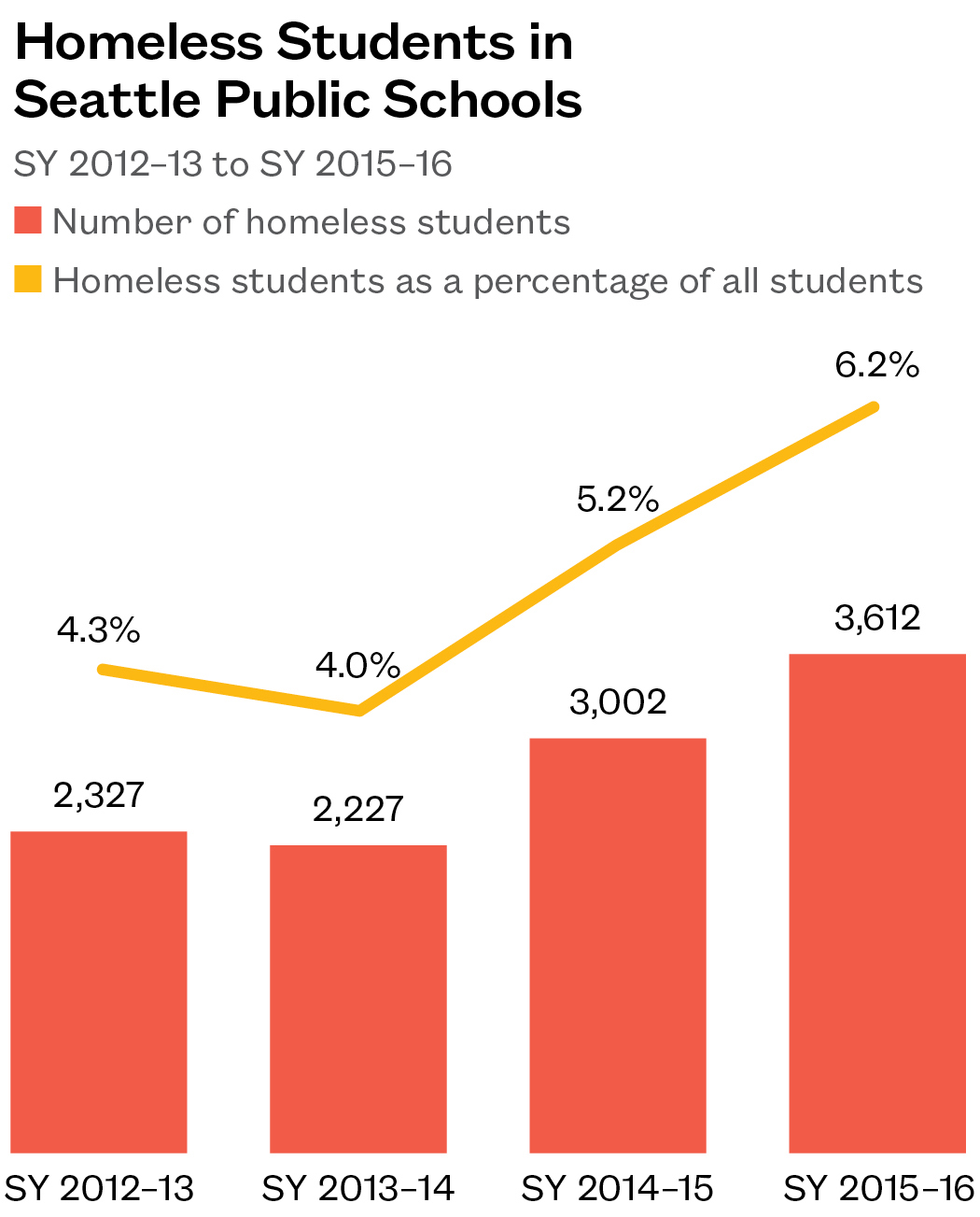 - Since SY 2012–13, the number of homeless students increased by 55%, to 3,612. Over the same period, total enrollment rose by only 7%. The percentage of students identified as homeless also increased, to 6.2%.