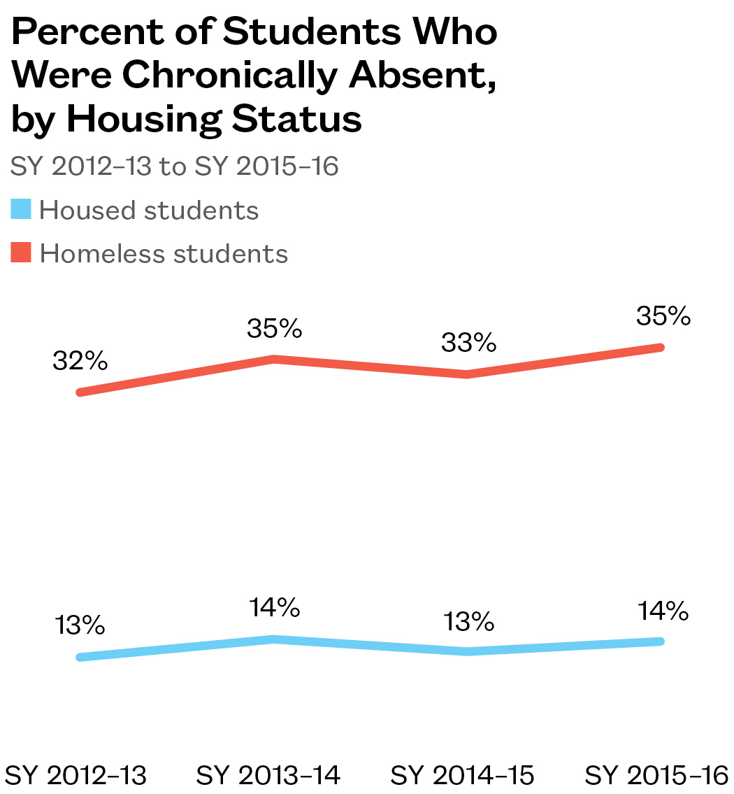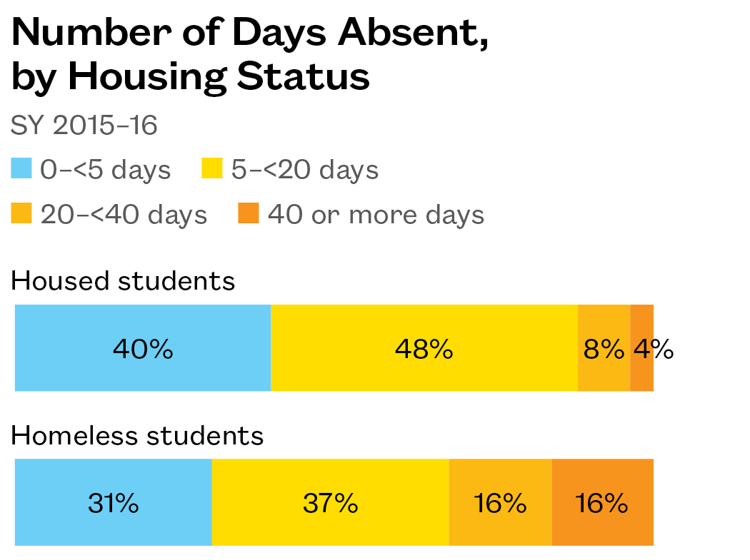 - More than a third of homeless students were chronically absent in SY 2015–16, meaning they missed 18 days or more of instruction. This is 2.5 times the rate at which housed students missed the same amount of school.