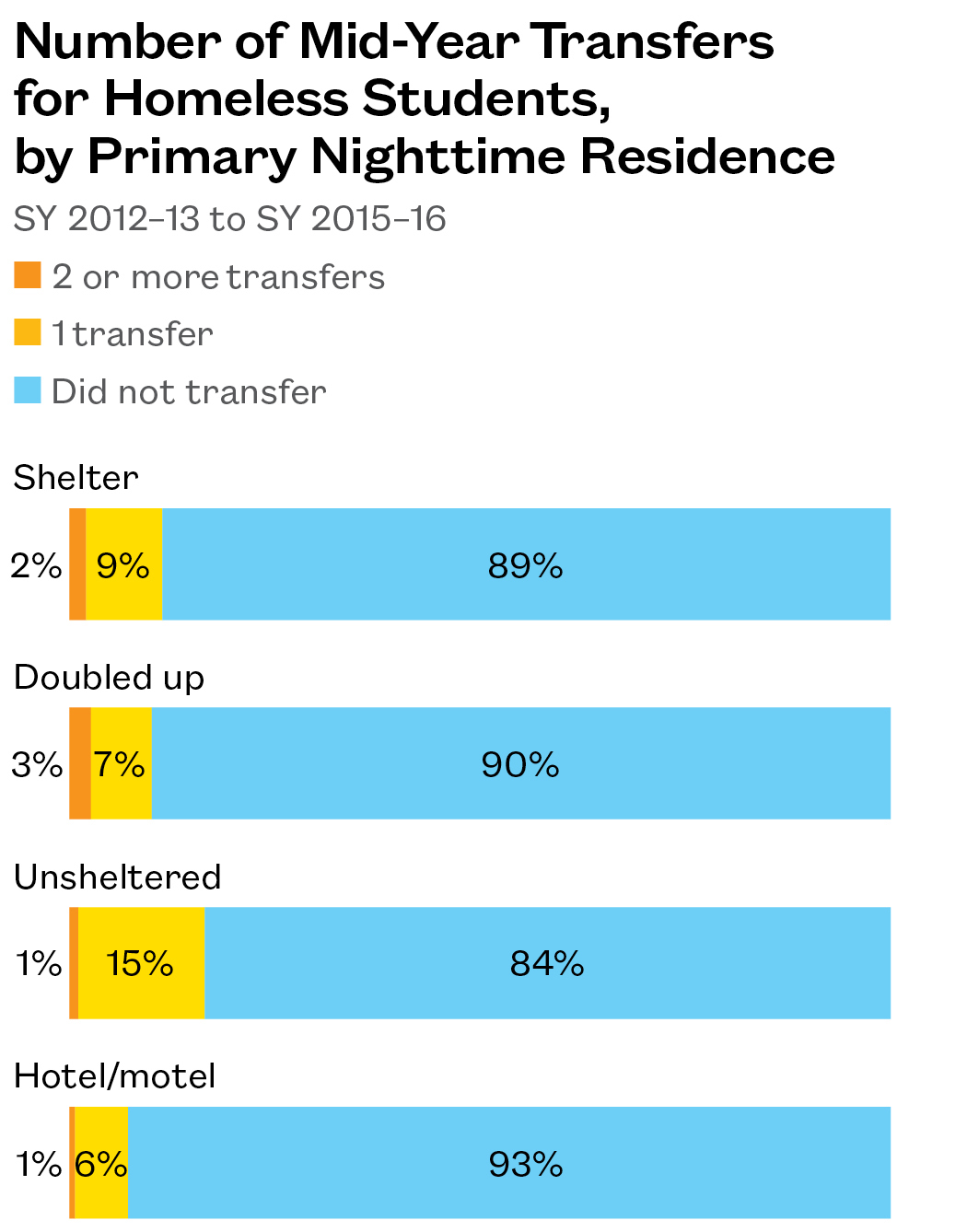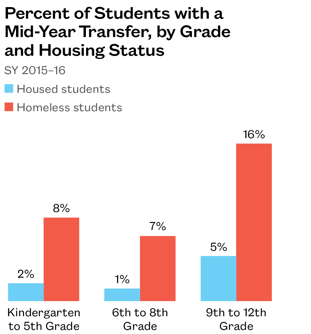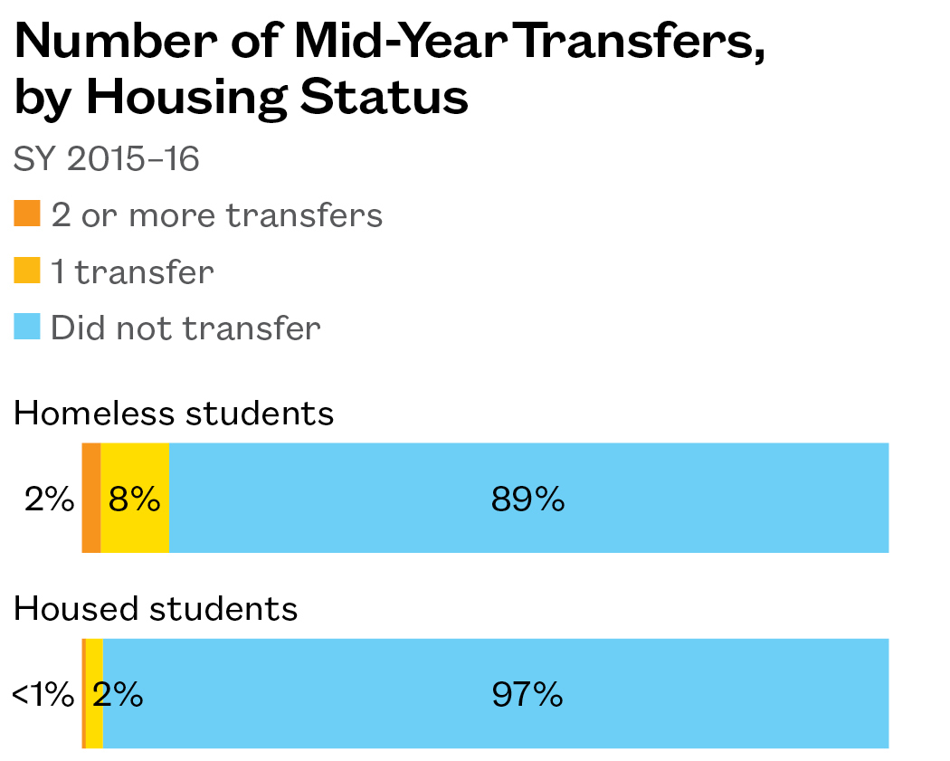 - Over 2% of homeless students had to transfer schools more than once. This represents a rate of high mobility 4.5 times that seen among housed students.