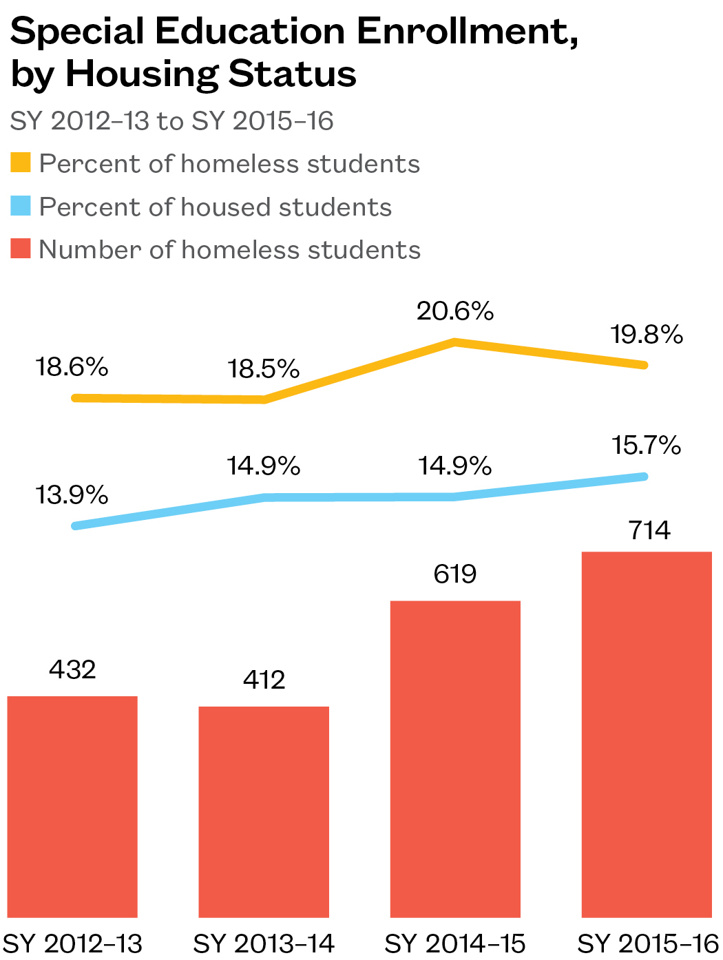 - Close to one in five homeless students received special education services in SY 2015–16. The number of homeless students has increased 65% since SY 2012–13, more than the overall growth in homelessness during that time.