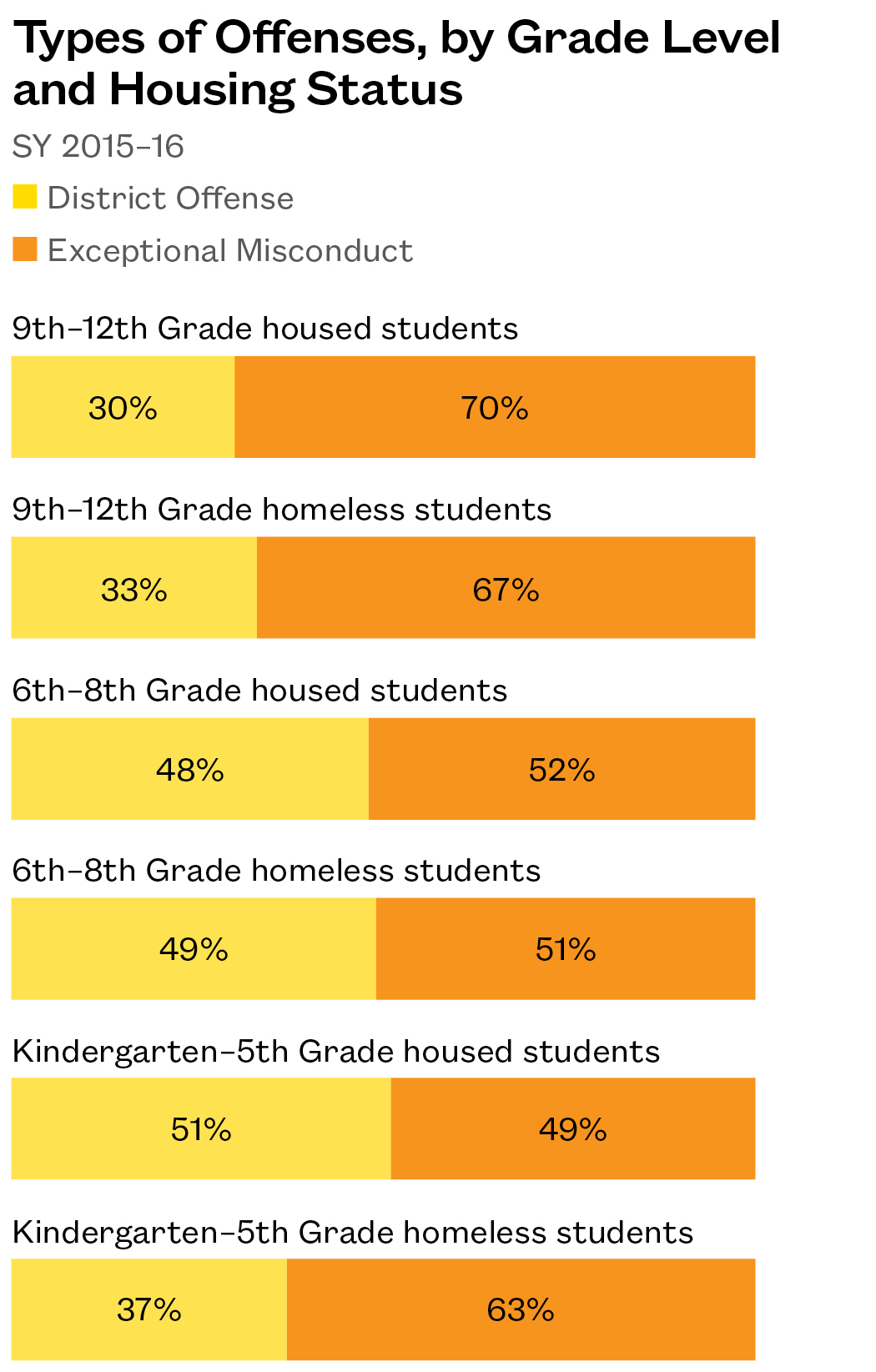 - In elementary school, homeless students were more likely to be disciplined for the more severe offenses categorized by SPS as “Exceptional Misconduct.” Sixty-three percent of offenses committed by homeless students in elementary school were in this category.
