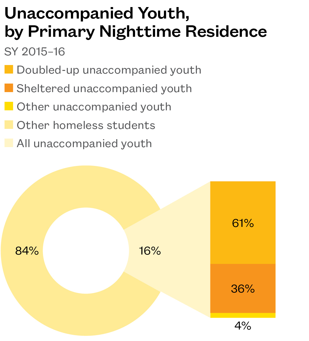 - Of all unaccompanied youth in SY 2015–16, 61% lived doubled up with another household, 36% were in a shelter, and 4% lived in a hotel or motel or were unsheltered.