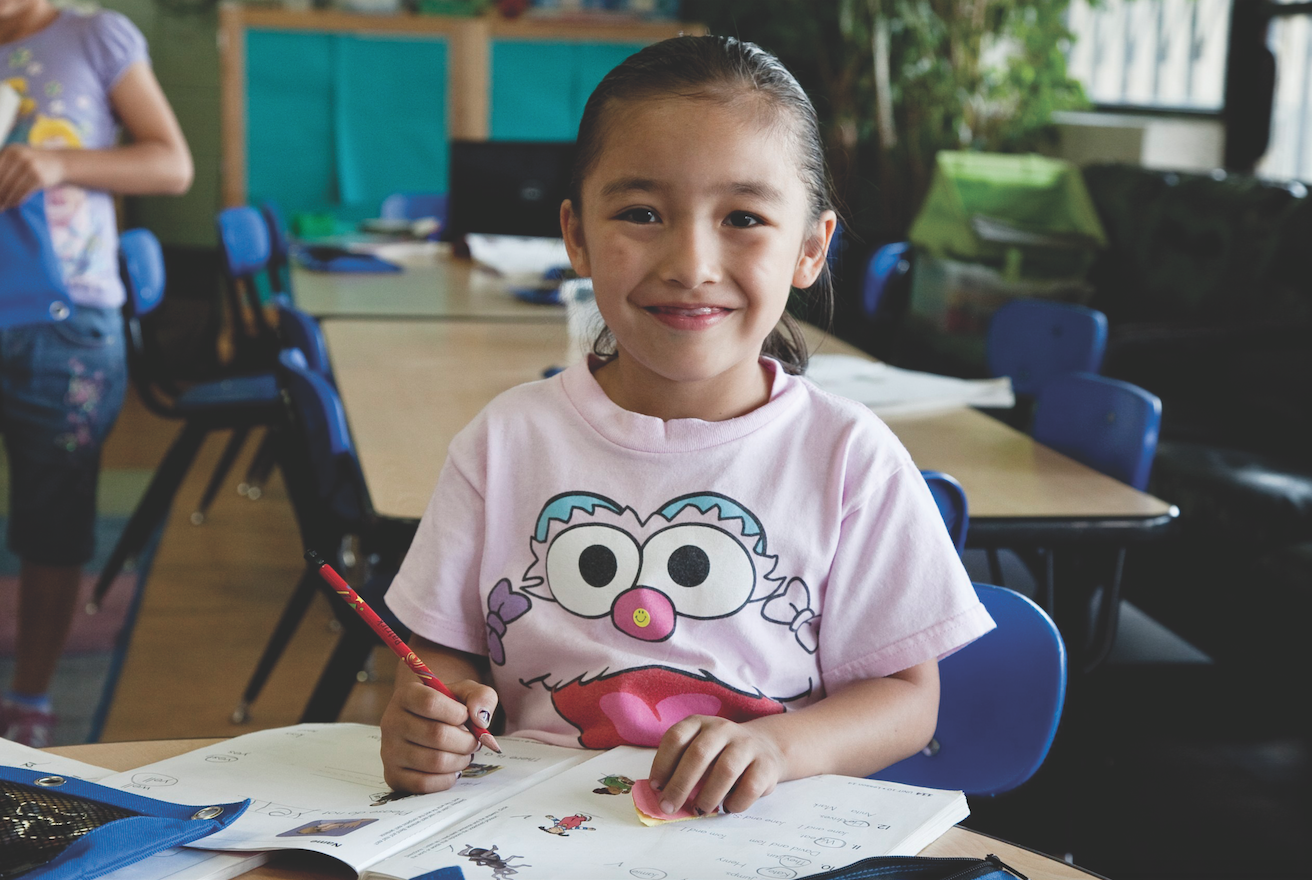 A young student enjoys the learning process.