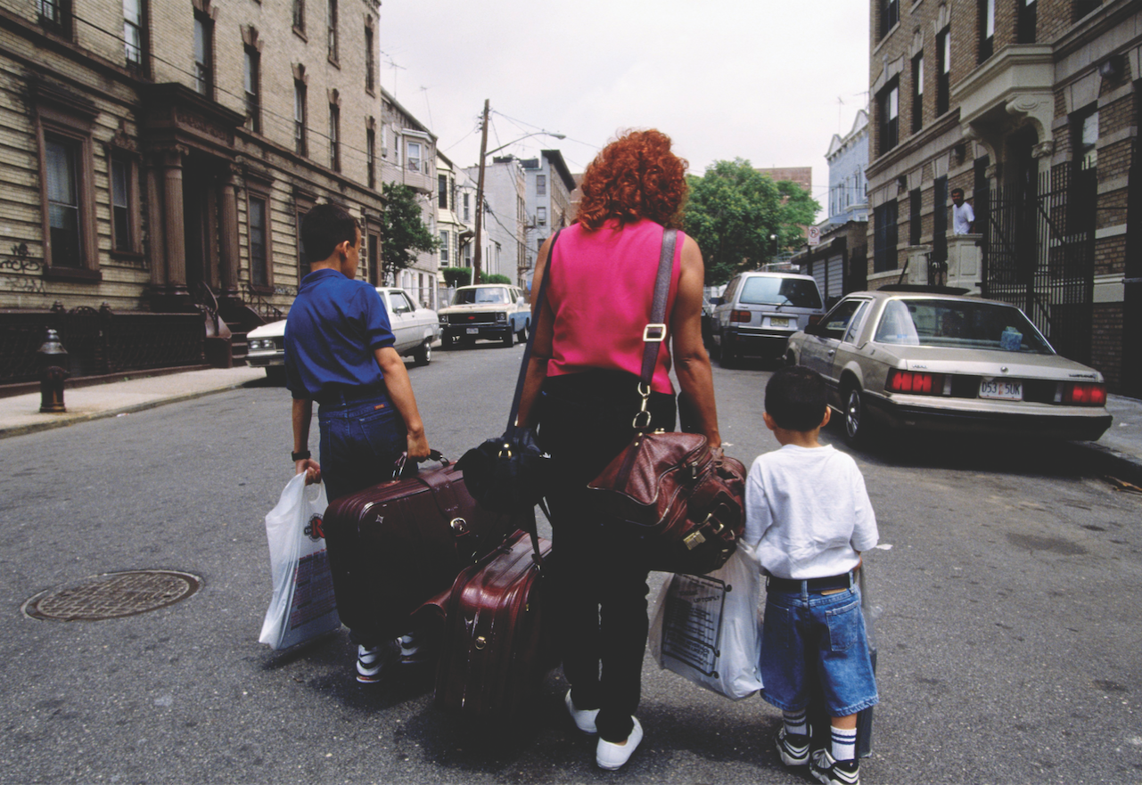 Back cover: A woman and her sons, fleeing domestic violence, carry their possessions from their home.