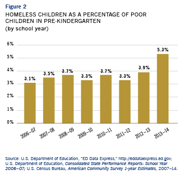 Institute for Children, Poverty, and Homelessness, American Almanac of Family Homelessness, 2015 ■ U.S. Department of Health and Human Services, Head Start Program Information Report, Survey Summary Report—National Level, 2007–14 ■ U.S. Department of Education, “ED Data Express.” ■ U.S. Department of Education, Consolidated State Performance Reports: School Year 2006–07 ■ U.S. Census Bureau, American Community Survey 1-year Estimates, 2007–14 ■ National Center for Homeless Education, Education for Homeless Children and Youth Program Data Collection Summary, 2010–14 ■ U.S. Department of Education, Office of Federal Student Aid, “Applicants with Homelessness Indicated on the FAFSA by State and Application Cycle” (unpublished data).