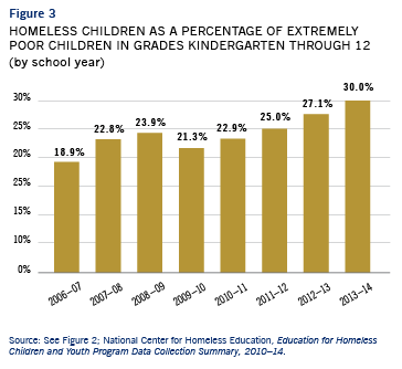 A similar approach can be undertaken to increase the number of homeless students identified in elementary and secondary schools. As with pre-K, state and local educational agencies can compare the number of homeless students to the number of school-aged children who are extremely poor (living at or below 50% of the poverty level, which amounted to $9,895 for a family of three in 2014). Nationally, 30.0% of all extremely poor students were homeless during school year 2013–14 (Figure 3).