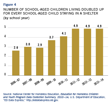 Since homeless children living doubled up for economic reasons are challenging to identify, school administrators can use a second, complementary measure to ensure that more homeless students receive essential services. Dividing the total number of doubled-up students by those living in shelter can help determine jurisdictions that are likely not as effective at identifying homeless students in doubled-up situations. Nationally, for every student living in a shelter, there were nearly five (4.9) staying doubled up during the 2013–14 school year (Figure 4).
