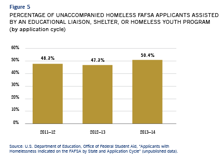 The only national data on college students experiencing homelessness is collected through the Free Application for Federal Student Aid (FAFSA). Homeless youth who are unaccompanied by a parent or guardian do not have to provide their parents’ financial information if their situation is verified by a school district homeless liaison or by the director of a U.S. Department of Housing and Urban Development-funded shelter or Runaway and Homeless Youth program. College financial aid administrators must make a determination for youth who do not have access to one of these three authorities. Half (50.4%) of all unaccompanied homeless students who filed the FAFSA during the 2013–14 application cycle were verified as independent students, considerably reducing their likelihood of securing the financial aid necessary to help make college a reality (Figure 5).