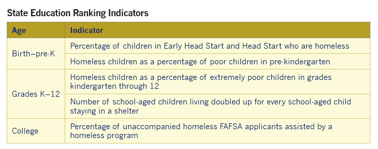 The State Education Rankings, released as part of the 2015 American Almanac of Family Homelessness, use publicly available data to illustrate important differences among states, but more detailed information is often available within states that can be used to determine progress at the district, school, or program level. ICPH hopes that states and communities will use their local data to discover what some programs are doing well and to improve those that may be underperforming. The five indicators that comprise the State Education Rankings, arranged by target age group, are shown in the following table: