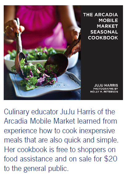 In 2014 Harris had the idea of putting together a basic cookbook to hand out to Mobile Market shoppers, but her co-workers were so excited by the idea that it mushroomed. With the help of a team of volunteers (and a generous grant), she created The Arcadia Mobile Market Seasonal Cookbook, a lavish, fully illustrated volume available to Mobile Market shoppers on food assistance for free and to the general public for $20 a copy.
