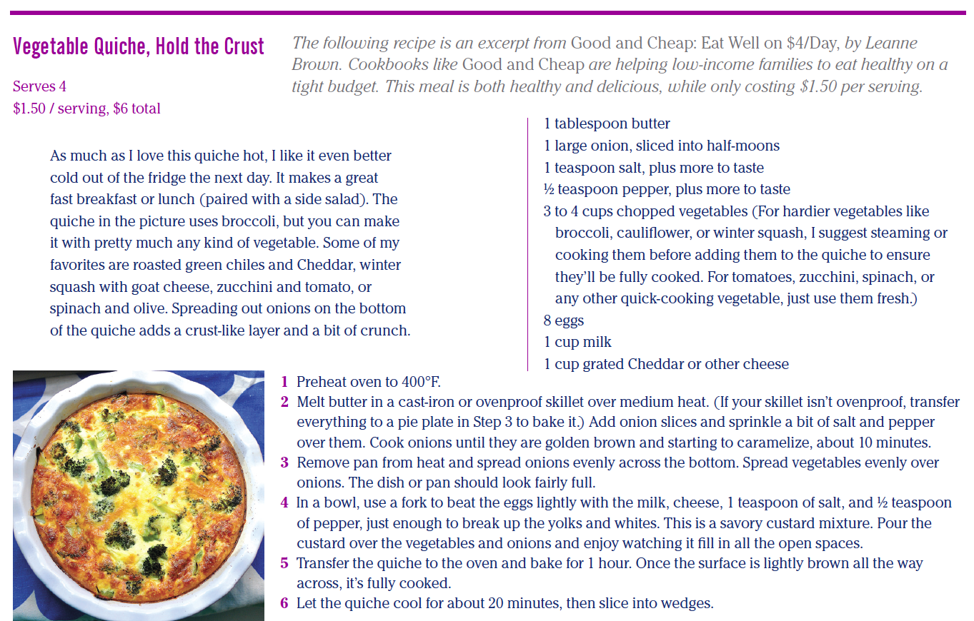 As a graduation project, she developed a set of recipes—colorful, loaded with vegetables, and economical—and prepared a beautifully illustrated PDF, which she made available for free online at www.leannebrown.com. Good and Cheap: Eat Well on $4/Day, as she called the collection, quickly went viral, with so many hundreds of thousands of people downloading it that her site crashed multiple times. Realizing that she had struck a chord, Brown mounted a Kickstarter campaign to fund a print run: if a supporter purchased a print edition of the book, which includes such recipes as Broiled Tilapia with Lime, Spicy Pulled Pork, and Green Chile and Cheddar Quesadillas, she would provide a printed copy to someone with limited or no computer access for free.