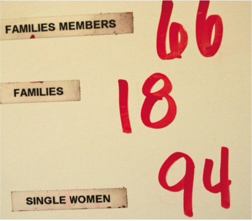 Phoenix, AZ: During the process of filming our documentary, on the edge, director Laura Vazquez and I visited the Watkins Overflow Shelter in a warehouse provided to United Methodist Outreach Ministries (UMOM) by the City of Phoenix. Because of my background as a former shelter director, this sign spoke to me, and I shuddered at the scope of homelessness among families and women in this city.