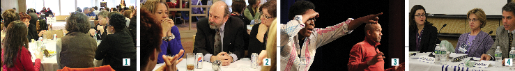 Below, from left: 1. and 2. Meals at the conference also served as a time for participants to connect with other professionals. Attendees engaged in roundtable discussions, conversing about various topics relating to homelessness and poverty, and sharing experiences from across the country. 3. The keynote address on Thursday was preceded by a skit performed by the City University of New York’s Creative Arts Team, which depicted a fictional homeless family. The actors also led a short question-and-answer session. 4. ICPH hosted 20 panels over the course of the conference, including this one on “The State of Permanent Housing.”