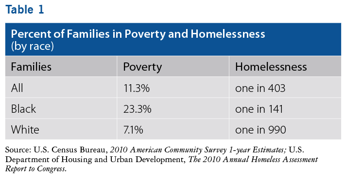 In 2010, nearly one-quarter (23.3%) of black families lived in poverty, three times the rate of white families (7.1%). Black families also experience homelessness at much higher rates. In 2010, one out of every 141 persons in black families stayed in a homeless shelter, a rate seven times higher when compared with persons in white families (one in 990).