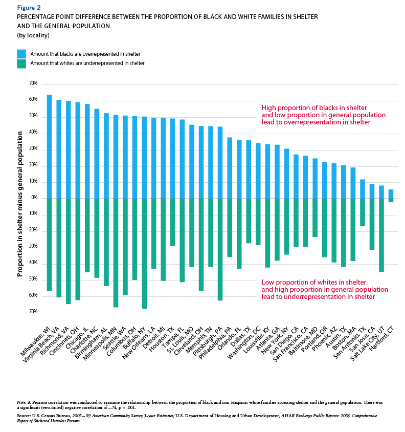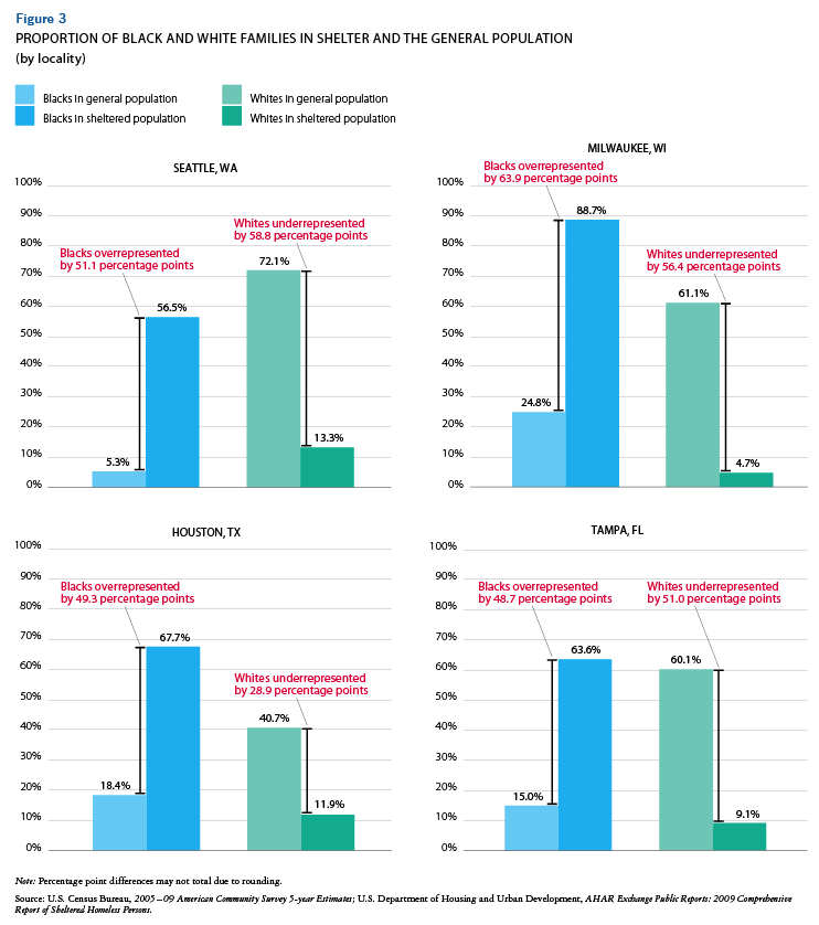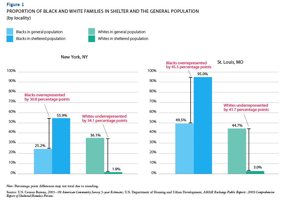 The stark reality is that black Americans are greatly overrepresented in U.S. homelessness and poverty statistics when compared to whites. Due to interrelated barriers to economic self-sufficiency and prosperity, such as institutionalized discrimination and multigenerational poverty, black families have unequal access to decent housing, employment, and education. These social exclusions leave blacks more likely to have smaller financial reserves to fall back on in emergency situations; reside in poor, segregated, and unsafe neighborhoods that lack community resources; and experience homelessness.
