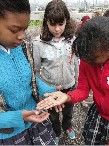 The Brooklyn Grange rooftop farm serves as an incubator of knowledge for the children in the City Growers education program as they examine insects and plants that they have never encountered.
