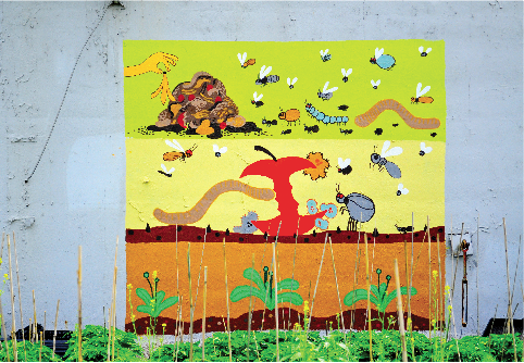 This vibrant mural by Max Bode helps children understand the stages of composting, which they can also witness firsthand on the Brooklyn Grange rooftop farm.