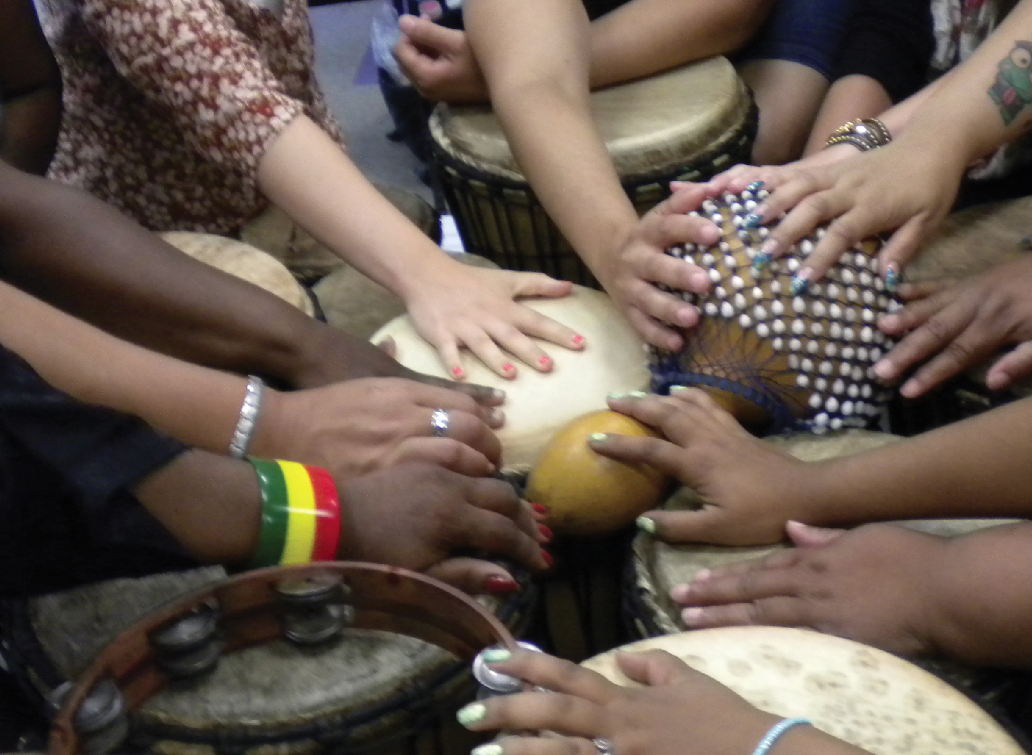 Beyond Freedom participants place their hands on the drums they play during meetings. Playing drums provides mutual encouragement and emotional release.