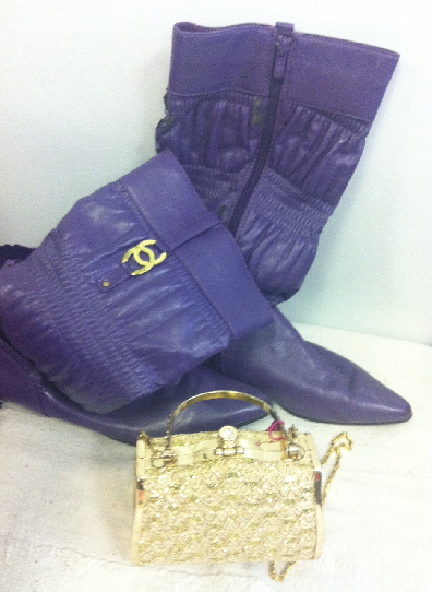 On display in the Beyond Freedom meeting room are the boots and handbag worn by a facilitator when she escaped her abuser. The items symbolize freedom and strength.