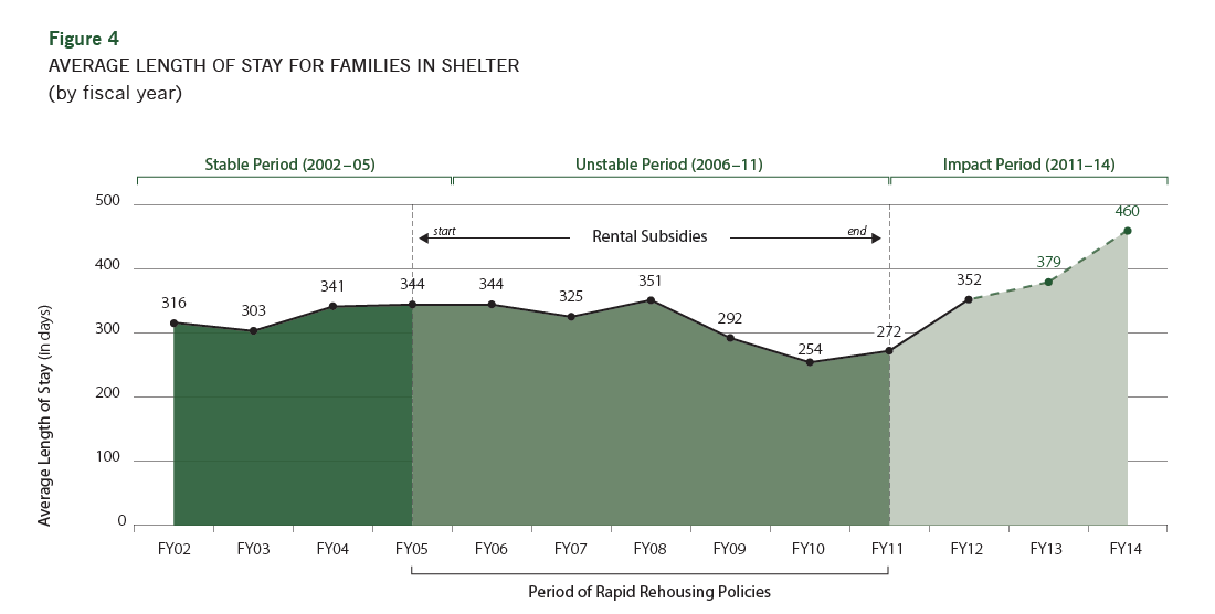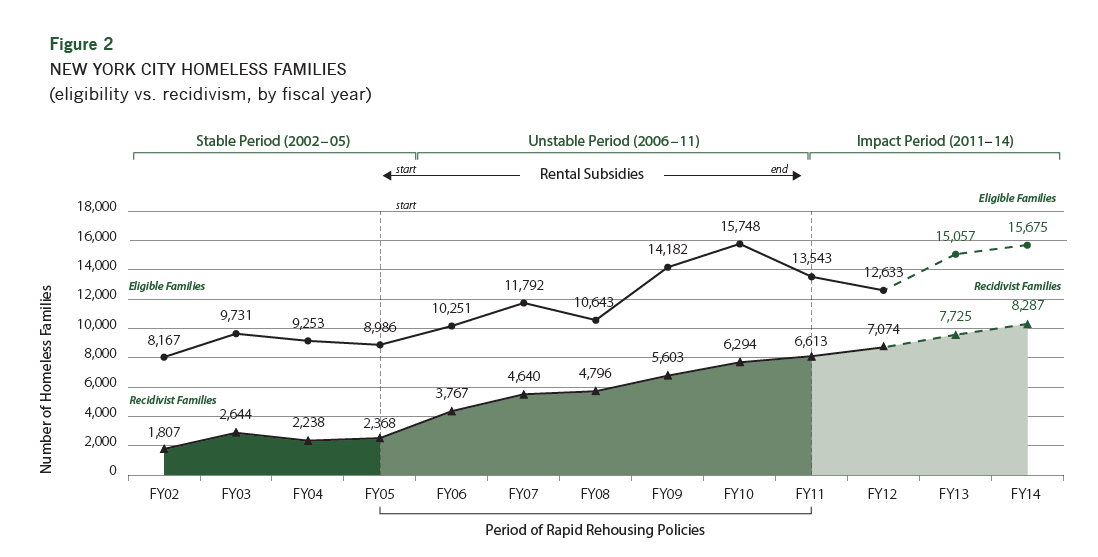 By FY11, when rapid re-housing rental subsidies were halted, the number of recidivist families had risen an unprecedented 179%, with little sign that it was leveling off. Today, the city’s recidivism rate stands at 56% (see Figure 3).(6) Moreover, a longitudinal analysis of recidivism through the “stable” and “unstable” periods of rapid re-housing initiatives projects recidivism rates of 58% and 62% for FY13 and FY14, respectively (see Figure 3, “Impact Period,” FY11–14).