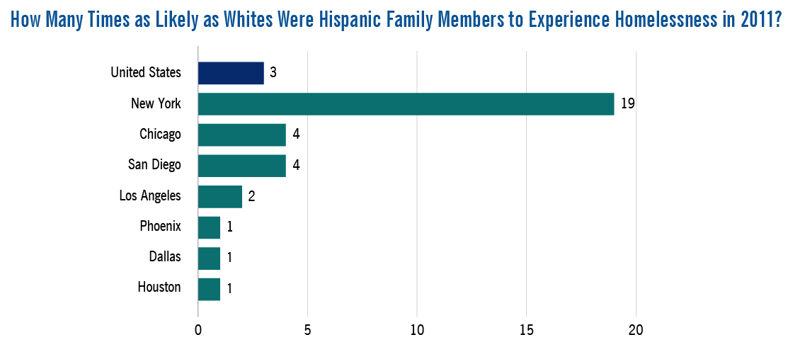 Studies over the years have continually shown that Hispanic families are overrepresented in U.S. homelessness and poverty statistics when compared with whites. In 2011 over one-quarter (29.6%) of Hispanic families with children lived in poverty, more than twice the rate of white families (12.2%). Hispanic families also experience homelessness at much higher rates. One of every 396 Hispanic family members stayed in a homeless shelter in 2011, a rate nearly three times higher than that for persons in white families (one in 1,067; see Figure 1).