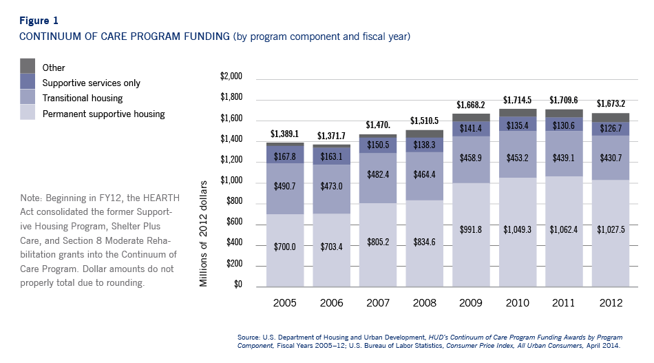 U.S. Department of Housing and Urban Development, Notice of Funding Availability (NOFA) for the Continuum of Care Program, Fiscal Years 2005–13 ■ U.S. Department of Housing and Urban Development, HUD’s CoC Homeless Assistance Programs—Homeless Populations and Subpopulations, 2007–13; U.S. Department of Housing and Urban Development, Annual Homeless Assessment Reports to Congress, 2010–12.